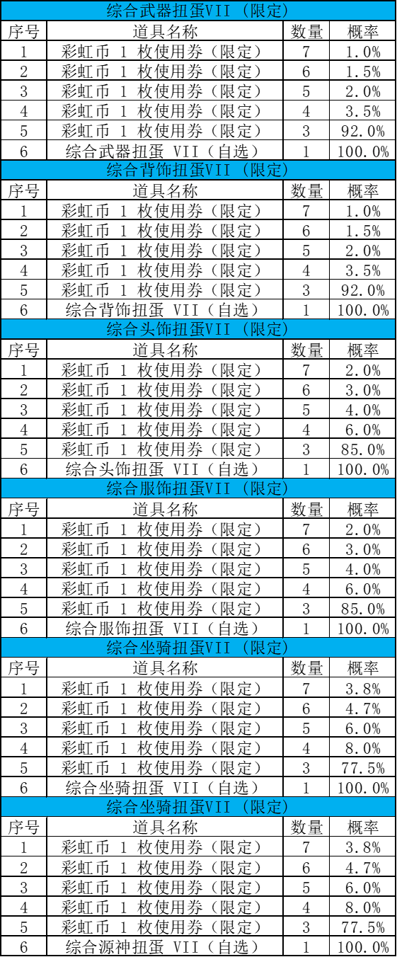 「综合武器/背饰/头饰/服饰/坐骑/源神扭蛋VII」奖池内容及概率公示如下: