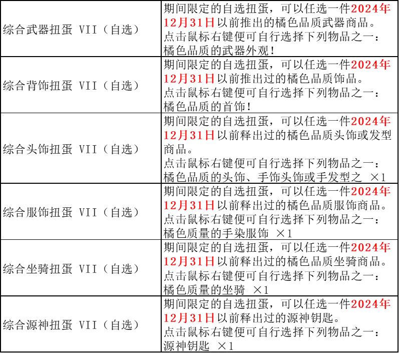 6.元气铺限时商品新增多款限定扭蛋:综合武器扭蛋VII(限定)、综合背饰扭蛋VII(限定)、综合头饰扭蛋VII(限定)、综合服饰扭蛋VII(限定)、综合坐骑扭蛋VII(限定)、综合源神扭蛋VII(限定),欢迎选购。